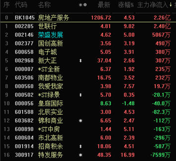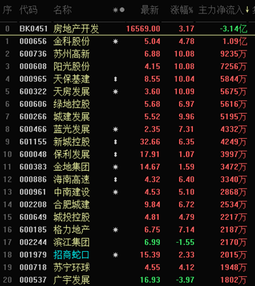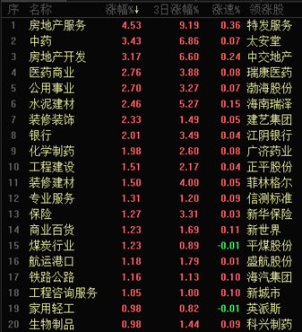 截至午間收盤,房地產(chǎn)領(lǐng)域領(lǐng)漲,細分行業(yè)房地產(chǎn)服務以4.53%的漲幅居東方財富行業(yè)漲幅榜首、房地產(chǎn)開發(fā)則以3.17%位居第三。