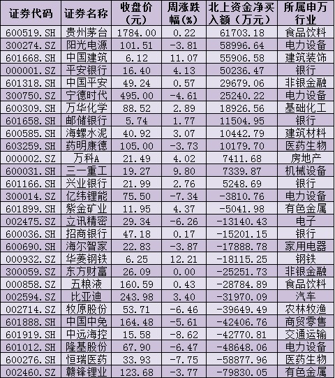 資金方面,北向資金3日均呈流出狀態(tài),累計(jì)凈賣出金額達(dá)65.57億元。從前十大成交活躍股來看,本周,貴州茅臺(tái)、陽光電源、中國(guó)建筑、平安銀行等4只個(gè)股,北向資金凈買入金額均超5億元。另外,恒瑞醫(yī)藥、贛鋒鋰業(yè)等個(gè)股遭北向資金凈賣出金額均超5億元。