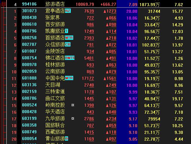 周二,住宿餐飲板塊和旅游酒店板塊聯(lián)袂爆發(fā),截至收盤漲幅分別達(dá)9.83%和7.09%。具體來看,有16只旅游股直沖漲停,君亭酒店20CM漲停。