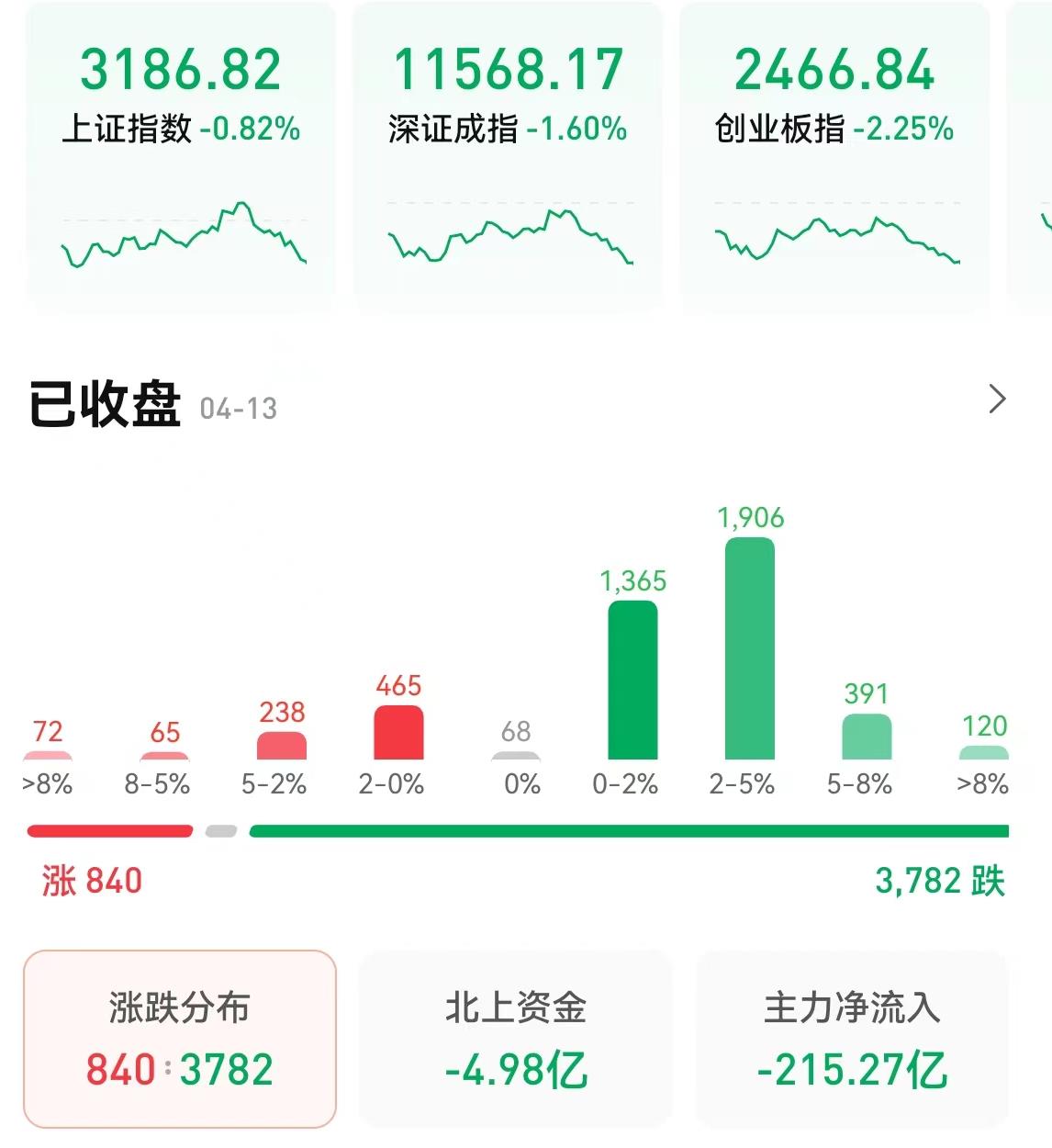 4月13日,A股三大指數(shù)呈現(xiàn)震蕩回落態(tài)勢。截至收盤,上證指數(shù)跌0.82%報3186.82點,深證成指跌1.6%報11568.17點,創(chuàng)業(yè)板指跌2.25%報2466.84點;兩市合計成交8734億元,北向資金凈賣出4.98億元。