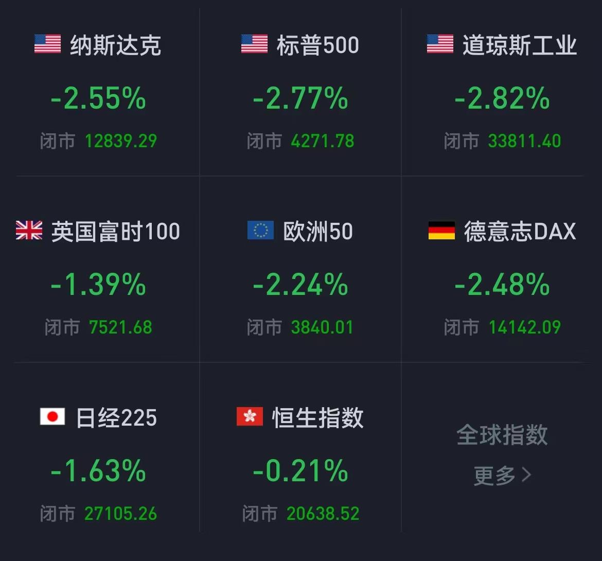 本周,道指跌1.86%,標(biāo)普500指數(shù)跌2.75%,納指跌2.55%。