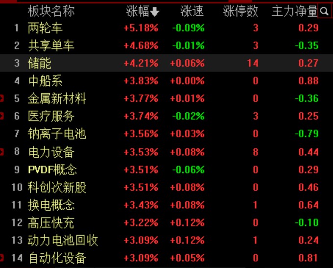 熱點(diǎn)板塊方面,截至7月14日上午收盤(pán),兩輪車(chē)、儲(chǔ)能、中船系、金屬新材料、醫(yī)療服務(wù)等板塊漲幅居前,公路鐵路運(yùn)輸、租售同權(quán)、房地產(chǎn)開(kāi)發(fā)、特色小鎮(zhèn)、廚衛(wèi)電器等板塊跌幅居前。