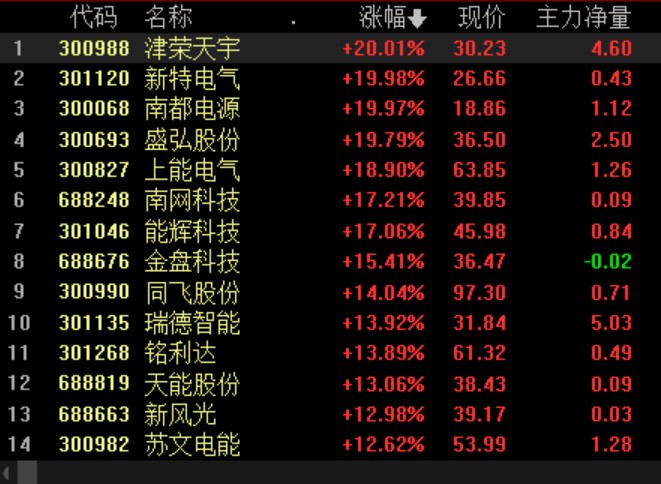 具體來(lái)看,7月14日上午,儲(chǔ)能板塊表現(xiàn)強(qiáng)勢(shì),漲幅達(dá)4.21%,板塊內(nèi)個(gè)股普漲,包括津榮天宇、新特電氣、南都電源、同力日升等在內(nèi)的14只概念股集體漲停。