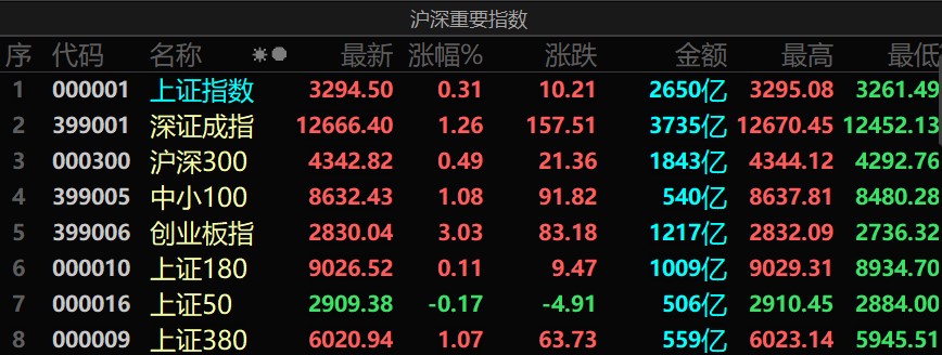 周四(7月14日),三大股指持續(xù)拉升,集體上漲。截至上午收盤(pán),上證指數(shù)漲0.31%,深成指漲1.26%,創(chuàng)業(yè)板指漲3.03%;滬深兩市合計(jì)成交額6385億元,總體來(lái)看,兩市個(gè)股漲多跌少。