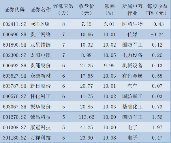 表:連續(xù)上漲超5天且今日收盤漲停股一覽