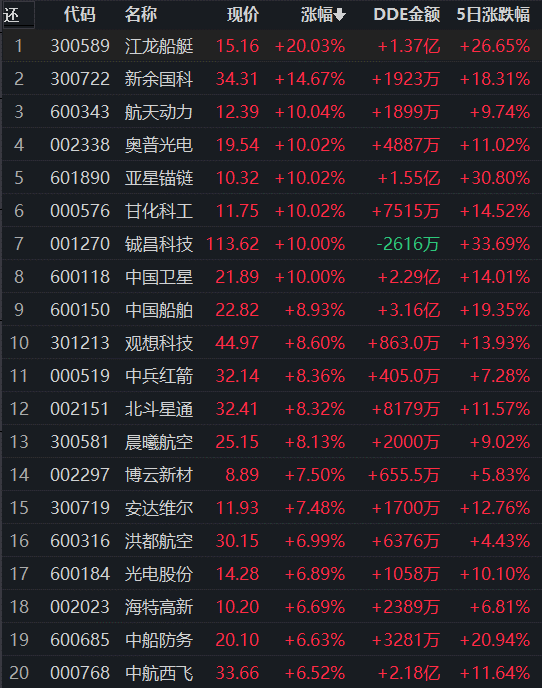 7月20日,國(guó)防軍工行業(yè)漲幅居首,達(dá)4.55%。行業(yè)99只交易中的個(gè)股,有98只上漲,其中,7只個(gè)股漲停。