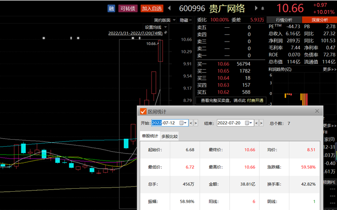 7月20日,貴廣網(wǎng)絡(luò)再度漲停,自7月12日以來,截至7月20日已連續(xù)7個(gè)交易日上漲,累計(jì)漲幅達(dá)59.58%,最近2個(gè)交易日連續(xù)收獲漲停板。