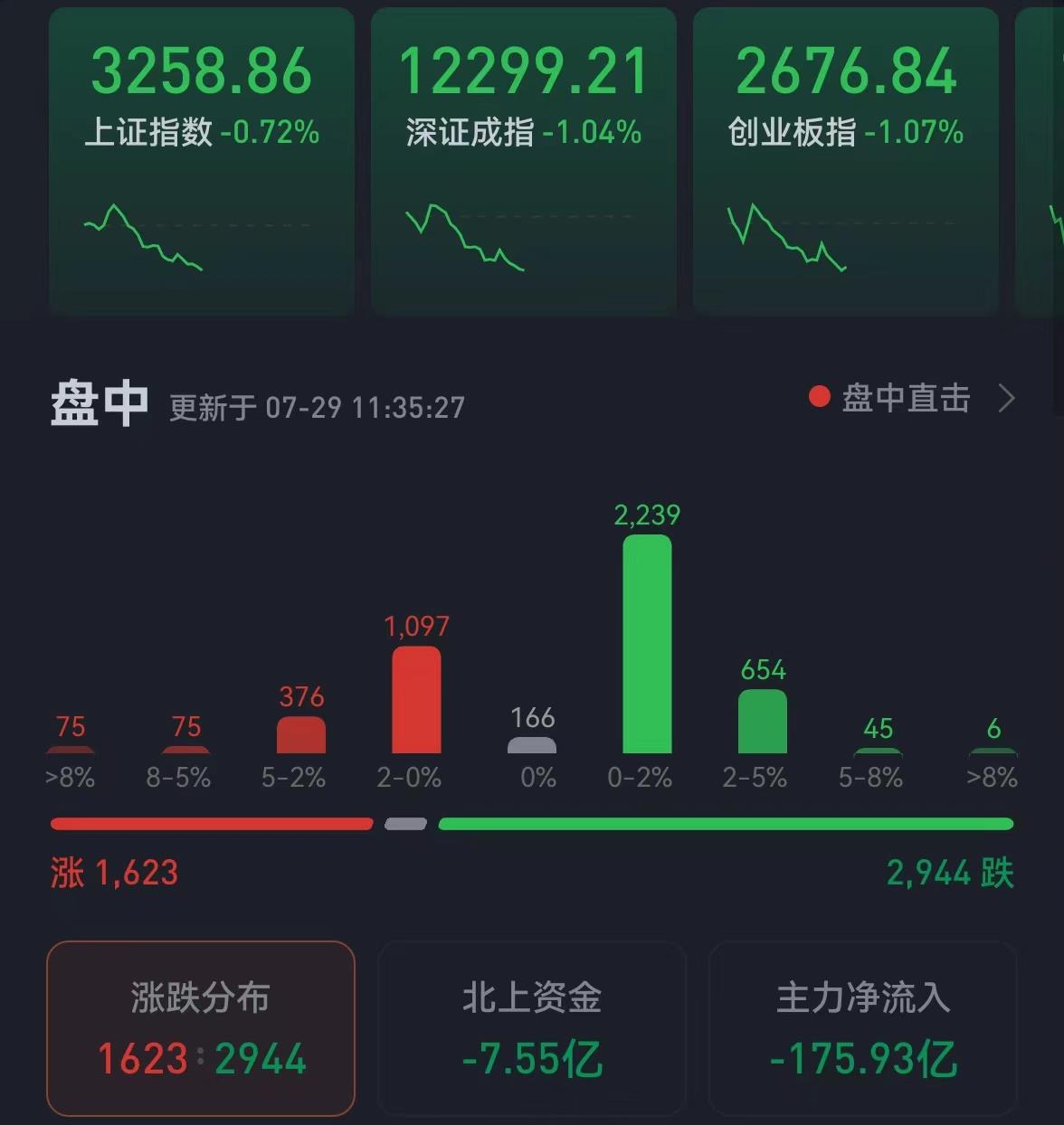 周五(7月29日),三大股指震蕩回落。截至上午收盤,上證指數(shù)跌幅達(dá)0.72%,報3258.86點;深證成指和創(chuàng)業(yè)板指跌幅分別為1.04%和1.07%;滬深兩市合計成交額6223.8億元,總體來看,兩市個股跌多漲少。