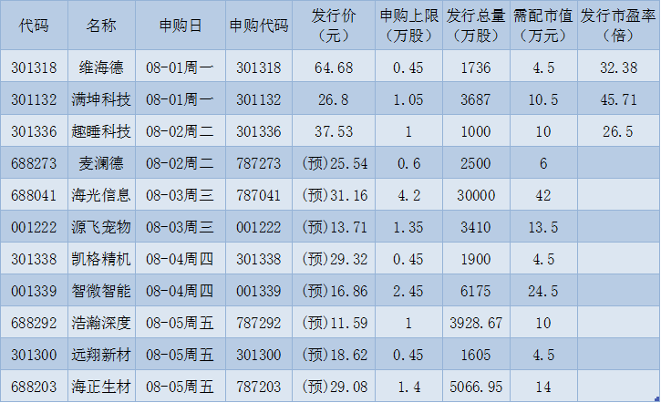 新股方面,根據(jù)發(fā)行安排,A股市場(chǎng)下周(8月日-8月5日)將有11只新股申購(gòu)。