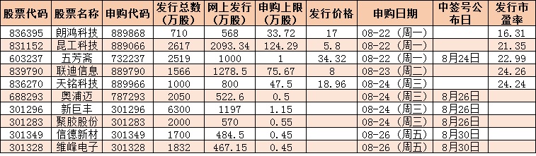 表:下周(8月22日-26日)10只新股發(fā)行情況: