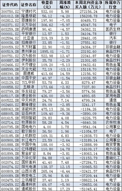 資金方面,北向資金本周累計凈買入金額達59.26億元。從前十大成交活躍股來看,本周,寧德時代、隆基綠能等2只個股,北向資金凈買入金額均超10億元。另外,通威股份、晶澳科技、立訊精密、特變電工、山西汾酒、陽光電源等個股遭北向資金凈賣出金額均超3億元。