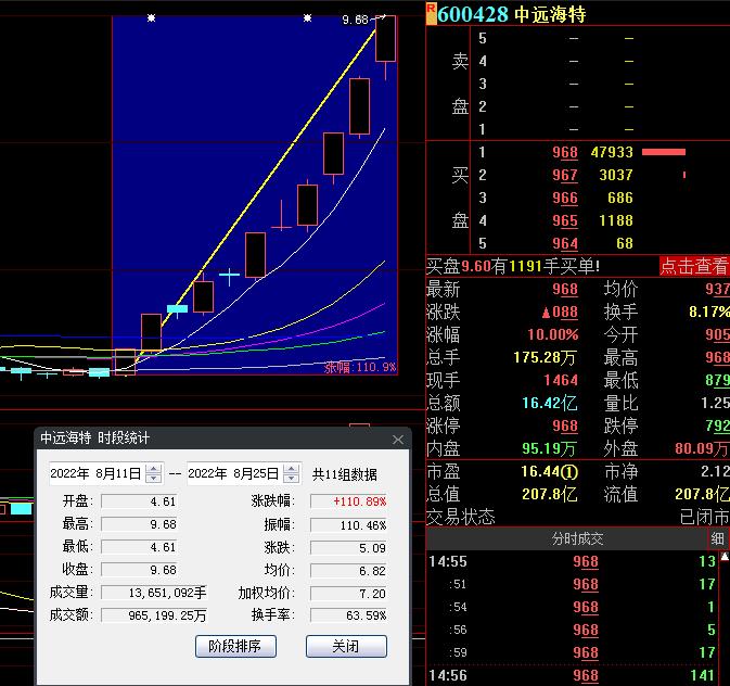 8月25日,熱門股中遠海特再度漲停,截至收盤,報9.68元,實現(xiàn)11連漲,期間累計漲幅達110.89%。