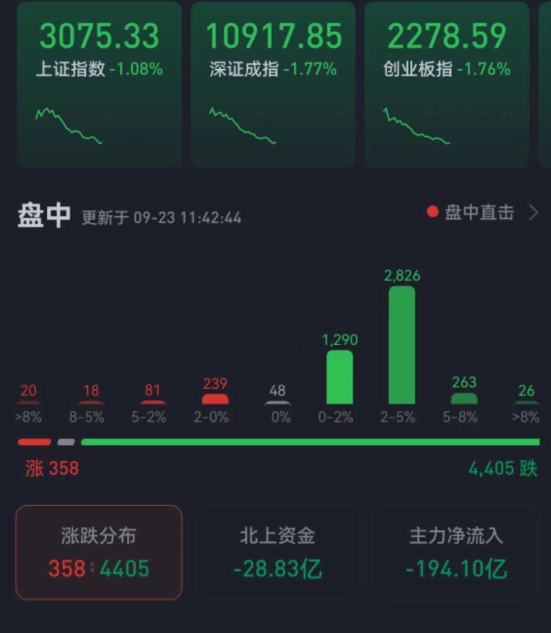 周五(9月23日),三大股指震蕩回落,全線飄綠,跌幅均超1%。截至上午收盤,上證指數(shù)跌幅達(dá)1.08%,報(bào)3075.33點(diǎn);深證成指和創(chuàng)業(yè)板指跌幅分別為1.77%和1.76%;滬深兩市合計(jì)成交額4236.7億元,總體來看,兩市個(gè)股跌多漲少,超4400只個(gè)股下跌。