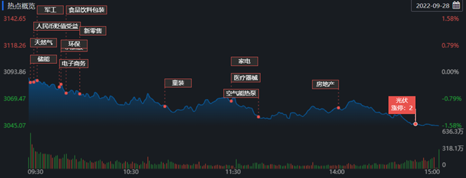 截至9月28日收盤(pán),上證指數(shù)跌1.58%,收?qǐng)?bào)3045.07點(diǎn),深證成指跌2.46%,收?qǐng)?bào)10899.70點(diǎn),創(chuàng)業(yè)板指跌2.57%,收?qǐng)?bào)2313.77點(diǎn);滬深兩市合計(jì)成交額6472.56億元,較前一交易日縮減2.85%;北向資金凈賣出38.40億元;總體來(lái)看,A股中上漲個(gè)股為438只,下跌個(gè)股4463只。
