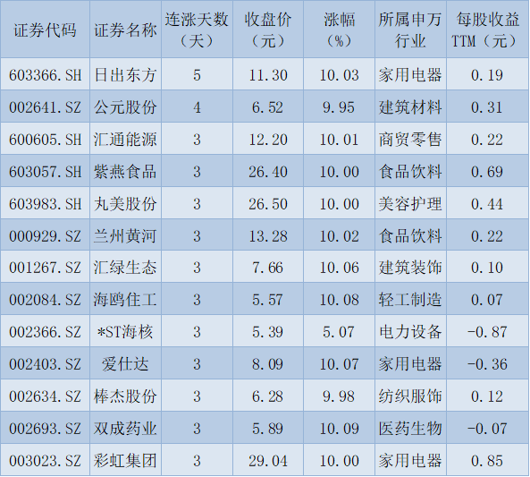 表:連續(xù)上漲3天且今日收盤(pán)漲停股一覽