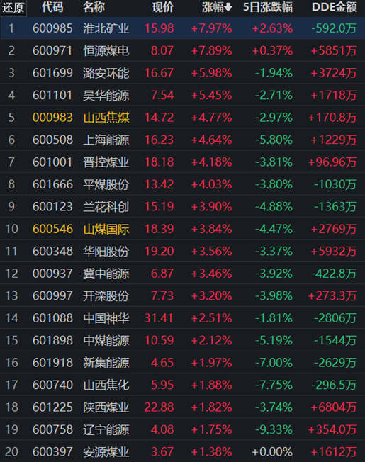 9月29日,申萬一級行業(yè)中煤炭行業(yè)領漲,漲幅達2.35%,獲得2.99億元大單資金的凈流入。行業(yè)38只交易中的個股,有31只上漲,占比81.58%,其中,4只個股漲幅超5%。