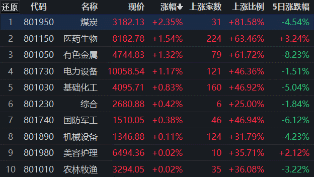申萬一級行業(yè)方面,31類行業(yè)中有10類上漲,占比32.26%,其中,煤炭行業(yè)漲2.35%,居首;下跌方面,房地產(chǎn)行業(yè)居首,跌幅達2.28%。