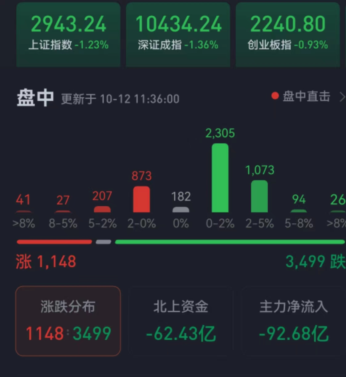 周三(10月12日),三大股指震蕩回落,全線飄綠。截至上午收盤,上證指數(shù)跌幅達(dá)1.23%,報(bào)2943.24點(diǎn);深證成指和創(chuàng)業(yè)板指跌幅分別為1.36%和0.93%;滬深兩市合計(jì)成交額3480.7億元,總體來(lái)看,兩市個(gè)股跌多漲少。