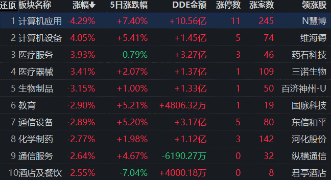 同花順行業(yè)方面,截至10月13日11:30,76類行業(yè)中67類上漲,占比88.16%,其中,計(jì)算機(jī)應(yīng)用行業(yè)漲幅達(dá)4.29%,排名首位。下跌的行業(yè)中,煤炭開采加工居首,跌幅達(dá)3.01%。