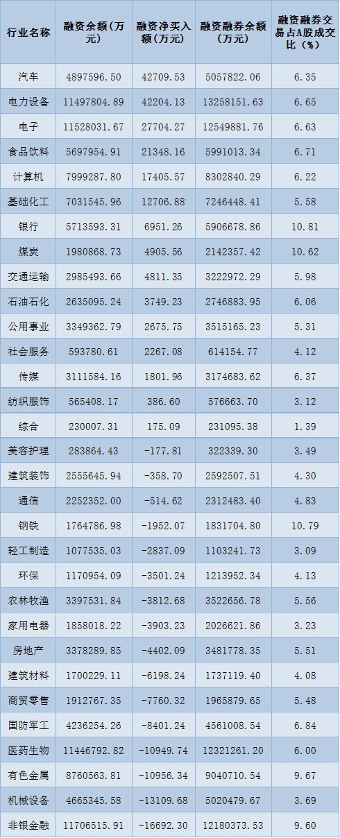 表:10月12日申萬一級(jí)行業(yè)兩融交易情況: