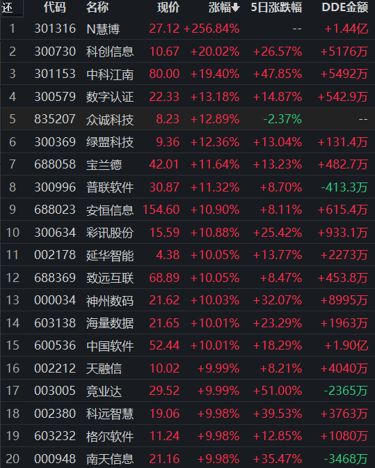 從漲幅居首的計(jì)算機(jī)應(yīng)用看,截至10月13日11:30,該行業(yè)交易的248只個(gè)股中,有245只上漲,其中71只漲幅超5%。從資金流向看,該行業(yè)今天上午大單資金凈流入額達(dá)10.56億元,居行業(yè)第1位。