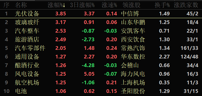 東方財富行業(yè)方面,截至10月25日11:30,86類行業(yè)中46類上漲,占比53.49%,其中,光伏設(shè)備行業(yè)漲幅達(dá)3.85%,排名首位,此外,玻璃玻纖行業(yè)漲幅也超3%。下跌的行業(yè)中,教育居首,跌幅達(dá)1.93%。