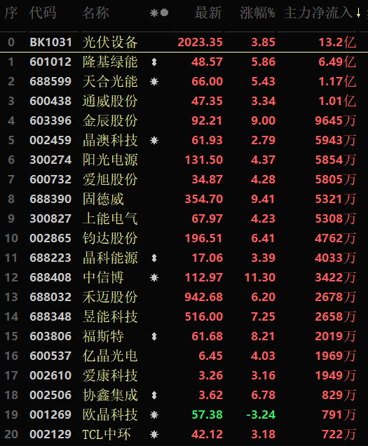 從漲幅居首的光伏設(shè)備行業(yè)看,截至10月25日11:30,該行業(yè)交易中的48只個股有45只上漲,其中15只漲幅超5%。從資金流向看,該行業(yè)上午大單資金凈流入額達(dá)13.2億元,居行業(yè)第1位。