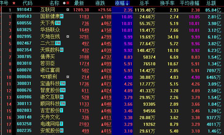 具體看,截至11月10日上午收盤(pán),互聯(lián)網(wǎng)板塊異動(dòng)拉升,漲幅居首達(dá)2.35%。其中,國(guó)新健康、天地在線、天下秀、華揚(yáng)聯(lián)眾、二六三、天娛數(shù)科等概念股聯(lián)袂漲停。