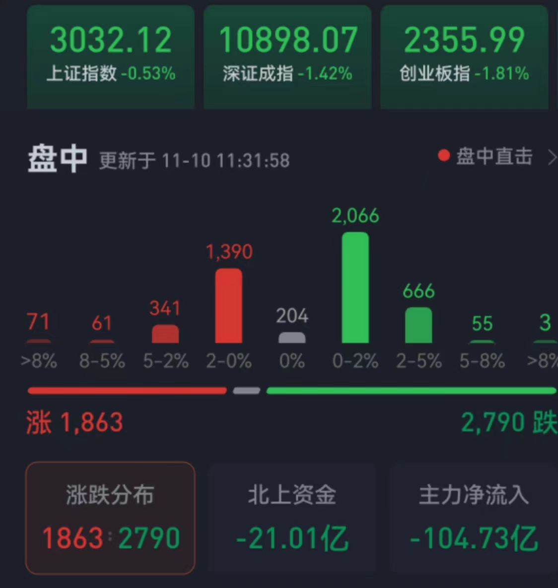 周四(11月10日),A股三大股指繼續(xù)震蕩調(diào)整。截至上午收盤(pán),上證指數(shù)跌幅達(dá)0.53%,報(bào)3032.12點(diǎn);深證成指和創(chuàng)業(yè)板指跌幅分別為1.42%和1.81%;滬深兩市合計(jì)成交額5161.24億元,總體來(lái)看,兩市個(gè)股跌多漲少。