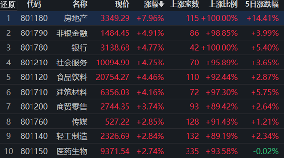 31類申萬一級行業(yè)中,有30類上漲,其中,房地產漲幅達7.96%,居首,非銀金融和銀行緊隨其后;下跌方面,僅公用事業(yè)下跌,跌幅0.49%。