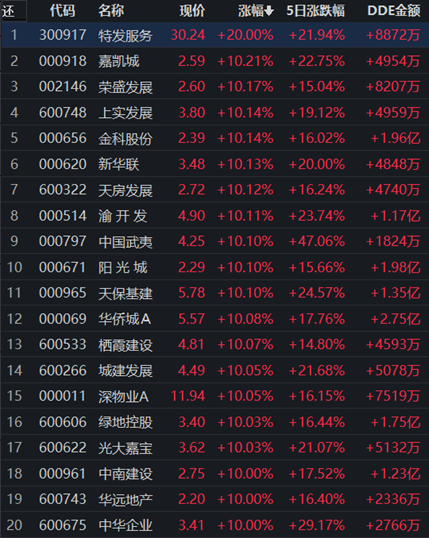 11月29日,申萬一級行業(yè)中房地產行業(yè)領漲,漲幅達7.96%,獲得40.15億元大單資金的凈流入,居資金流入行業(yè)第4位。行業(yè)中115只交易中的個股,全線上漲,其中,82只個股漲幅超5%。