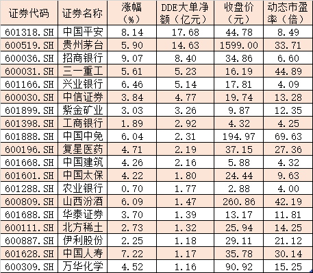 表:11月29日大單資金凈流入超1億元的上證50指數(shù)成份股