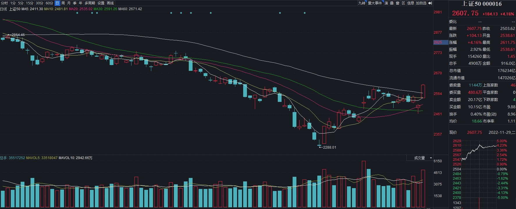 隨著A股市場回暖,市場投資情緒有所恢復,各路資金也紛紛入場布局,上證50指數(shù)也企穩(wěn)反彈,11月1日至29日期間累計漲13.58%。其中,11月29日,上證50指數(shù)全天高開高走,截至收盤,該指數(shù)漲幅達4.16%。個股方面,保利發(fā)展、招商銀行漲幅均超9%,分別達到9.61%、9.07%,中國平安、中國人壽、興業(yè)銀行、山西汾酒、中國中免、貴州茅臺、海螺水泥、三一重工等8只個股漲幅也均逾5%。