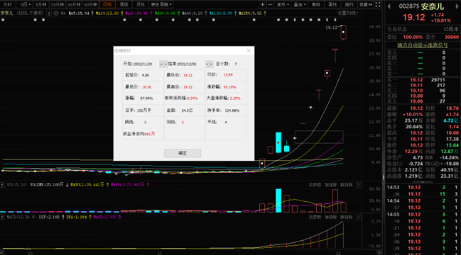 12月2日,安奈兒以19.12元封漲停板報收,漲幅達(dá)10.01%。該股自11月24日以來,截至12月2日已連續(xù)7個交易日均以漲停價報收,累計(jì)漲幅達(dá)95.10%。該股最新A股總市值達(dá)40.55億元,A股流通市值23.31億元。
