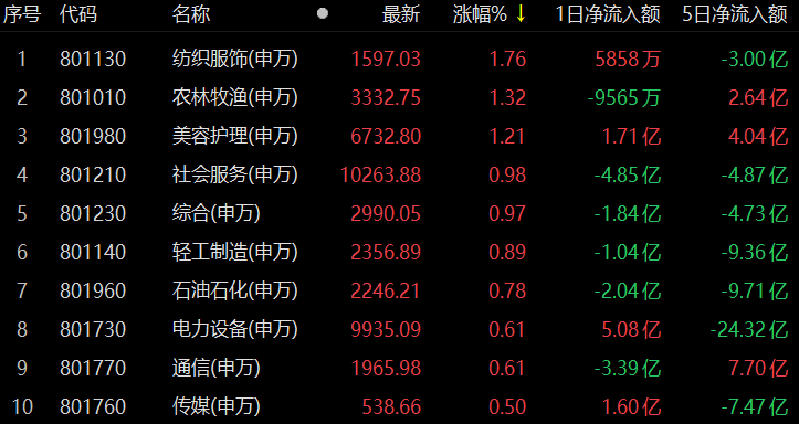 31類申萬一級行業(yè)中,有17類上漲,其中,紡織服飾漲幅達(dá)1.76%,居首,農(nóng)林牧漁和美容護(hù)理緊隨其后,漲幅均超1%;下跌方面,房地產(chǎn)居首,跌幅達(dá)1.97%。
