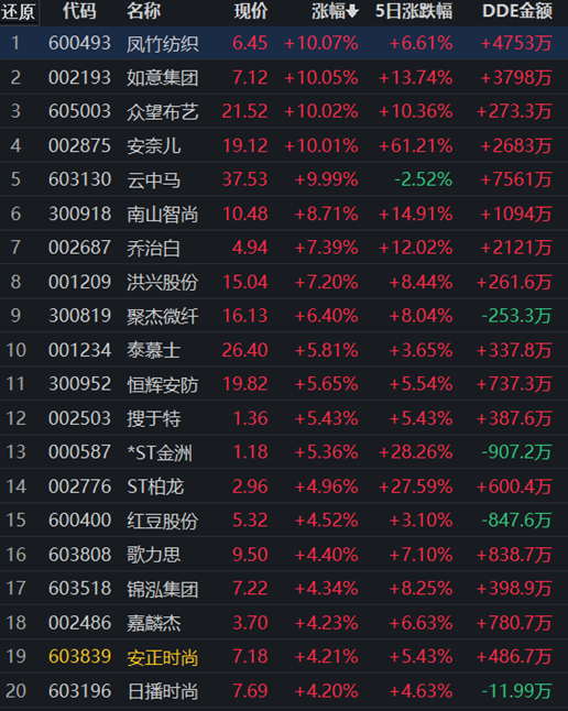 12月2日,申萬一級行業(yè)中紡織服飾行業(yè)領(lǐng)漲,漲幅達(dá)1.76%,獲得5858萬元大單資金的凈流入,居資金流入行業(yè)第5位。行業(yè)中113只交易中的個股,有102只上漲,其中,13只個股漲幅超5%。