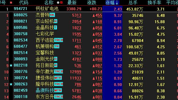 具體看,截至12月6日上午收盤,鈣鈦礦電池板塊異動(dòng)拉升,漲幅居首,達(dá)2.43%。其中,杰普特、京山輕機(jī)、金晶科技等概念股漲幅均超6%。