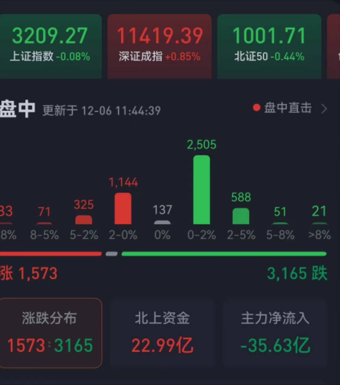 周二(12月6日),三大股指繼續(xù)震蕩分化,漲跌不一。截至上午收盤,上證指數(shù)微跌0.08%,報(bào)3209.27點(diǎn);深證成指漲0.85%,創(chuàng)業(yè)板指漲1.07%;滬深兩市合計(jì)成交額6544.1億元,總體來看,兩市個(gè)股跌多漲少。
