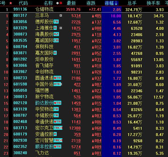 具體看,截至12月8日上午收盤,倉儲物流板塊異動(dòng)拉升,漲幅居首達(dá)2.05%。其中,三羊馬漲停。