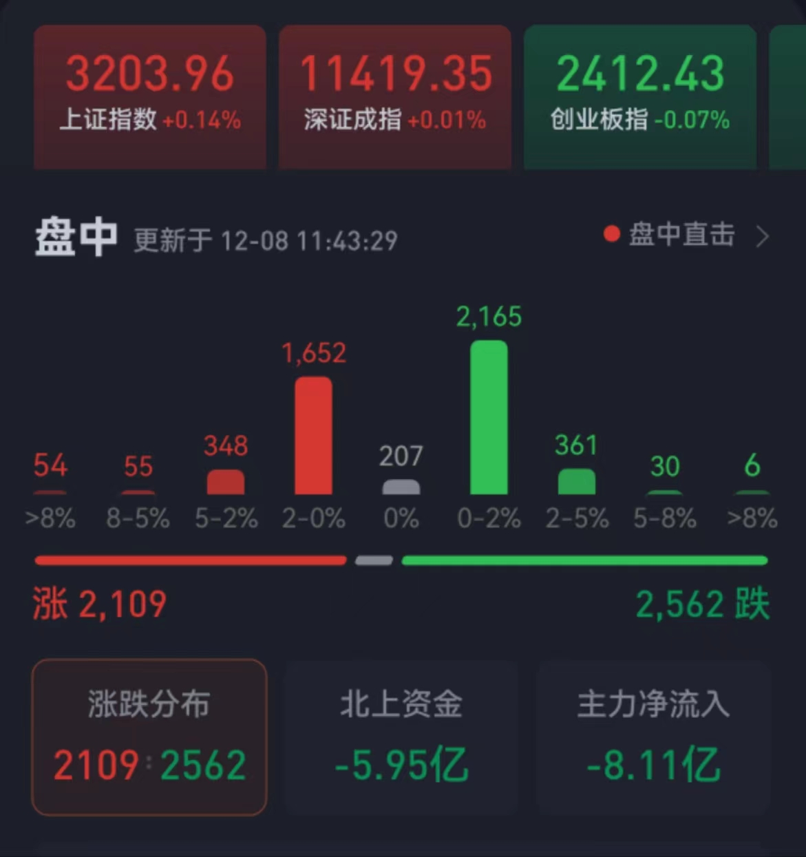 周四(12月8日),三大股指繼續(xù)震蕩分化,漲跌不一。截至上午收盤,上證指數(shù)微漲0.14%,報(bào)3203.96點(diǎn),收復(fù)3200點(diǎn)整數(shù)關(guān)口;深證成指漲0.01%,創(chuàng)業(yè)板指跌0.07%;滬深兩市合計(jì)成交額5191.4億元,總體來看,兩市個(gè)股跌多漲少。