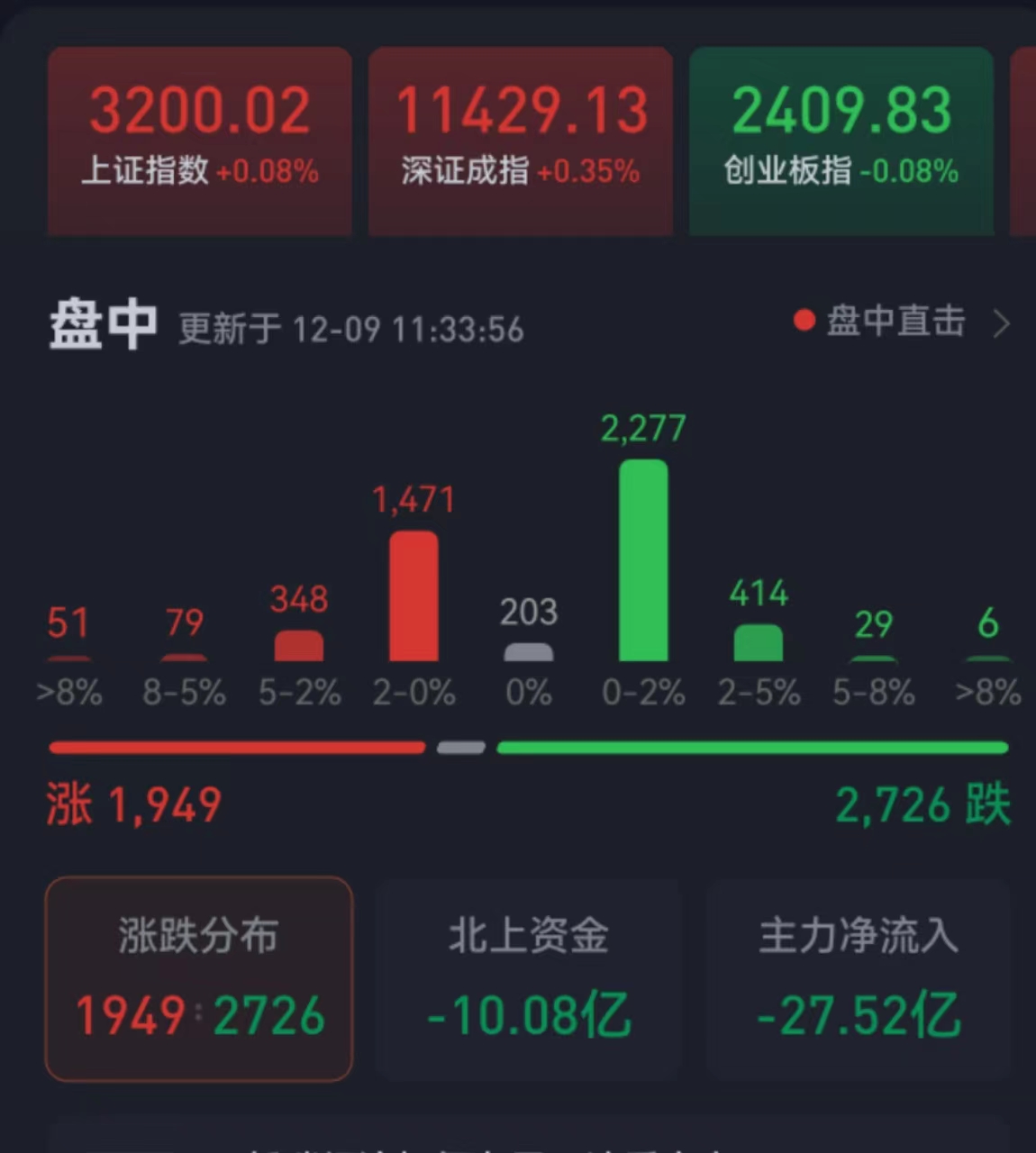 周五(12月9日),三大股指繼續(xù)震蕩分化,漲跌不一。截至上午收盤,上證指數(shù)漲0.08%,報3200.02點,收復3200點整數(shù)關口;深證成指漲0.35%,創(chuàng)業(yè)板指跌0.08%;滬深兩市合計成交額5556.9億元,總體來看,兩市個股跌多漲少。