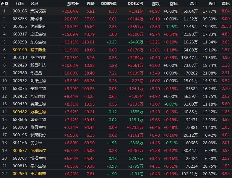 具體看,截至12月9日上午收盤,抗原檢測板塊漲幅居首達5.12%。其中,天瑞儀器、英諾特、毅昌科技、明德生物等多只概念股集體漲停。