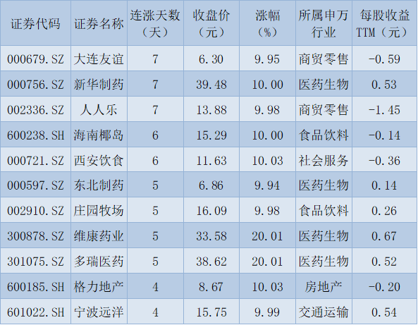 表:連續(xù)上漲4天且今日收盤漲停股一覽