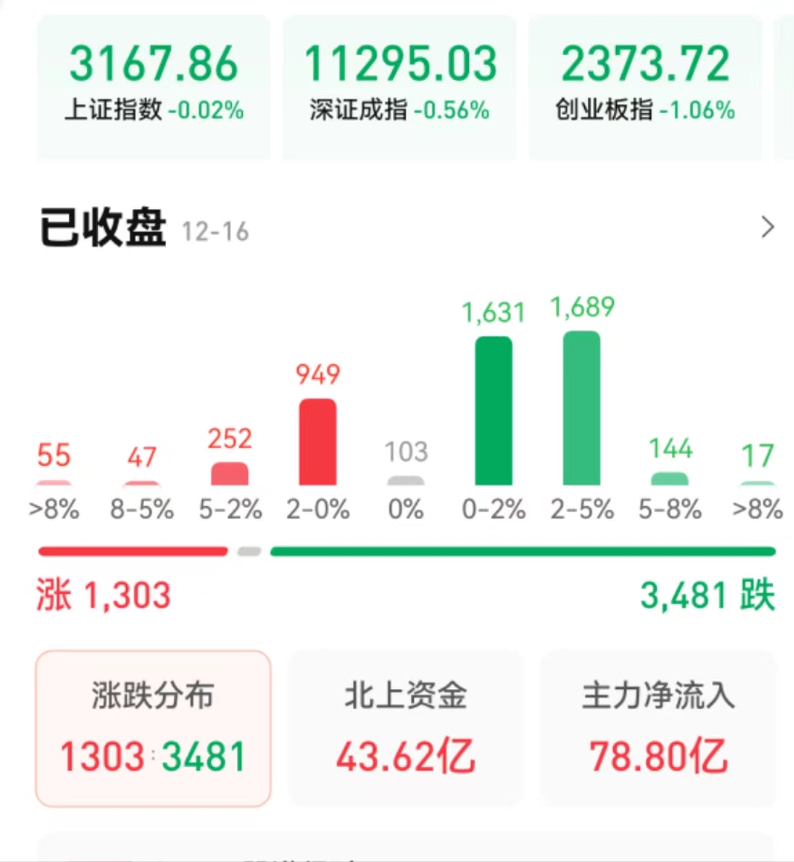 12月16日,A股三大指數(shù)震蕩走弱。截至收盤,上證指數(shù)微跌0.02%報(bào)3167.86點(diǎn),深證成指跌0.56%報(bào)11295.03點(diǎn),創(chuàng)業(yè)板指跌1.06%報(bào)2373.72點(diǎn);兩市合計(jì)成交7614億元,北上資金凈買入43.62億元??傮w上看,A股個(gè)股跌多漲少,量能有所萎縮。