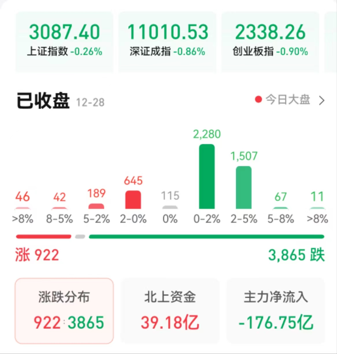 周三(12月28日),A股三大指數(shù)繼續(xù)震蕩,小幅下跌。截至收盤(pán),上證指數(shù)跌0.26%報(bào)3087.4點(diǎn),深證成指跌0.86%報(bào)11010.53點(diǎn),創(chuàng)業(yè)板指跌0.90%報(bào)2338.26點(diǎn);兩市合計(jì)成交6508億元,北向資金凈買(mǎi)入39.18億元。總體上看,A股個(gè)股跌多漲少,近3900只個(gè)股下跌。其中,漲停個(gè)股達(dá)40只,跌停個(gè)股達(dá)14只。