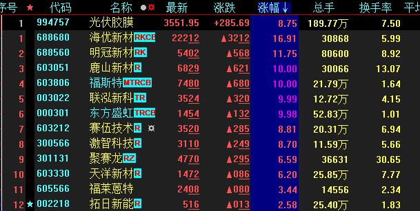 具體看,截至1月6日上午收盤,光伏膠膜板塊表現(xiàn)搶眼,漲幅達(dá)8.75%。其中,海優(yōu)新材漲16.91%。東方盛虹、聯(lián)泓新科、鹿山新材、東方盛虹等概念股紛紛漲停。