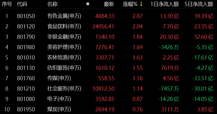 從概念板塊來看,基本金屬板塊領漲,漲幅達2.98%,雞肉概念、黃金概念、汽車一體化壓鑄、托育服務、職業(yè)教育等板塊表現(xiàn)強勢漲幅均超2%;6G概念領跌,跌幅達1.28%。