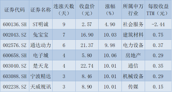 表:連續(xù)上漲3日且今日收盤漲停股一覽