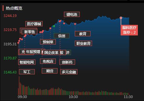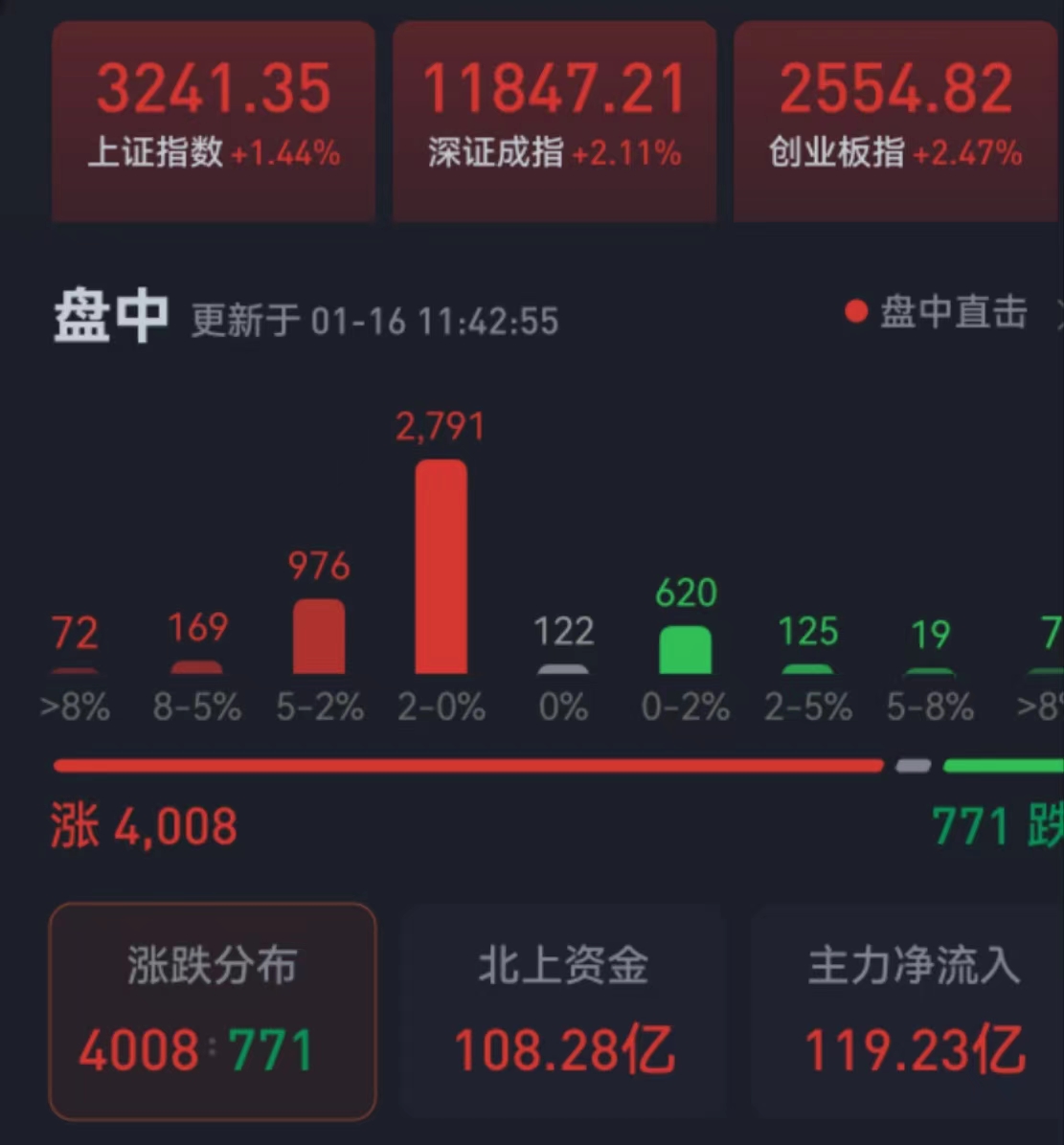 周一(1月16日),三大股指繼續(xù)震蕩走強,全線飄紅。截至上午收盤,上證指數(shù)漲幅達(dá)1.44%,報3241.35點;深證成指和創(chuàng)業(yè)板指漲幅分別為2.11%和2.47%;滬深兩市合計成交額5795.4億元??傮w來看,兩市個股漲多跌少,上漲個股近超4000只,其中,漲停個股達(dá)45只,跌停個股達(dá)5只。