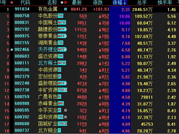 具體看,截至1月20日上午收盤,有色金屬板塊表現(xiàn)搶眼,漲幅達2.31%。其中,中色股份、中國稀土等概念股聯(lián)袂漲停。